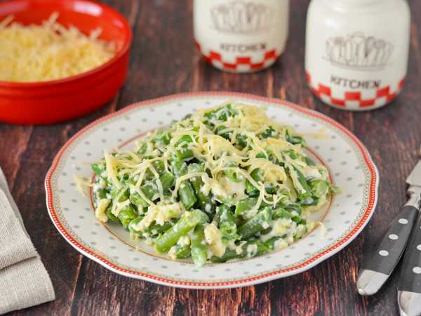 Соберите все необходимые продукты для приготовления полезного завтрака из стручковой фасоли с яйцом и сыром на сковороде.