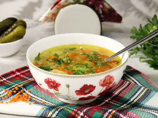 Соберите ингредиенты для приготовления супа из чечевицы с солеными огурцами.