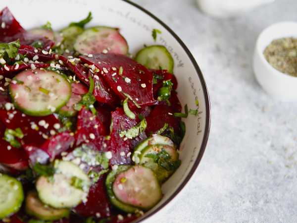 Соберите всё необходимое для приготовления салата из варёной свёклы со свежим огурцом.