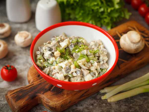 Все ингредиенты для приготовления салата «Орландо» с курицей и грибами - перед вами, на фото.