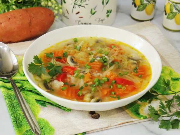 Соберите ингредиенты для приготовления овощного супа с креветками и грибами.