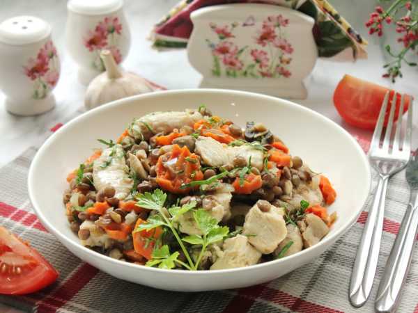 Соберите ингредиенты для приготовления курицы с зеленой чечевицей.