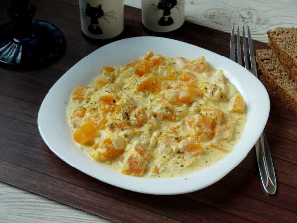 Возьмите ингредиенты, чтобы приготовить тыкву в сливочном соусе на сковороде.