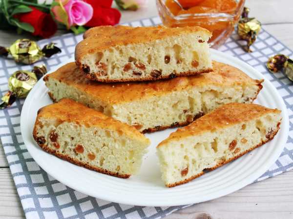 Для приготовления пирога на кефире с изюмом в духовке потребуются ингредиенты, указанные в списке. Они же показаны на фото.