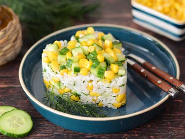 Подготовьте все необходимые продукты для салата с рисом, кукурузой и свежим огурцом.