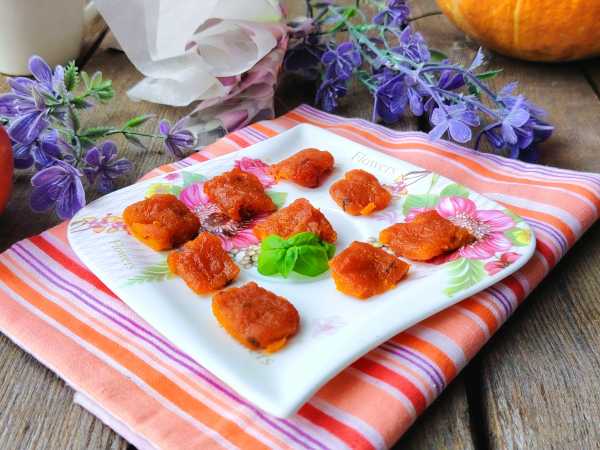 Собрать по списку продукты для приготовления тыквенных конфет в духовке. Можно свежую тыкву заменить замороженной, в таком случае добавление воды не потребуется, при размораживании овощ будет хорошо напитан влагой.