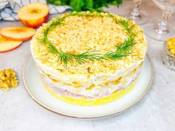 Соберите ингредиенты для приготовления салата «Сказка» с курицей слоями.