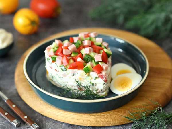 Соберите ингредиенты для приготовления салата «Оливье» с жареными грибами.