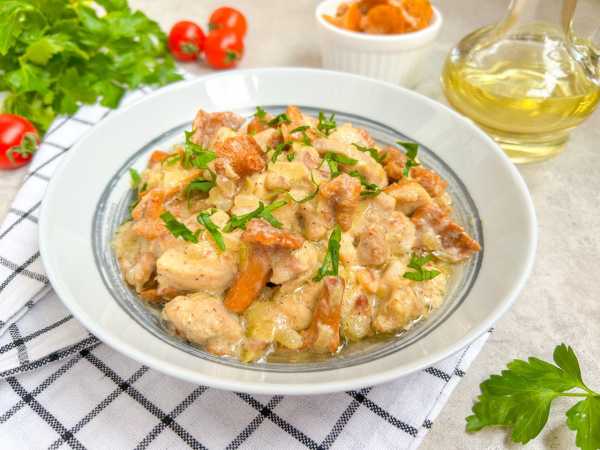 Соберите все необходимые ингредиенты для приготовления курицы с лисичками в сливочном соусе по списку.