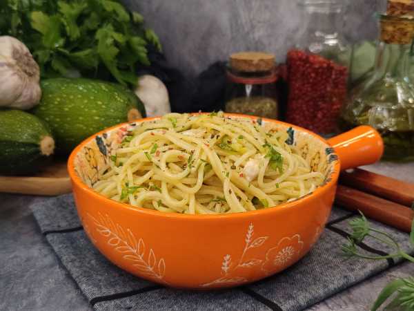 Соберите ингредиенты для приготовления макарон с курицей и кабачком. Я взяла свои любимые спагетти, но, конечно же, подойдет и любая короткая паста.