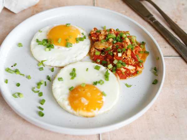 Все необходимые ингредиенты для приготовления яичницы с курицей и помидорами - перед вами.
