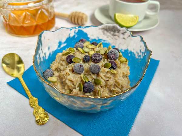 Соберите все необходимые ингредиенты для приготовления овсянки с голубикой.