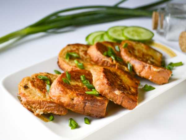 Батон нарежьте средними ломтиками. Также можете использовать любой белый хлеб.