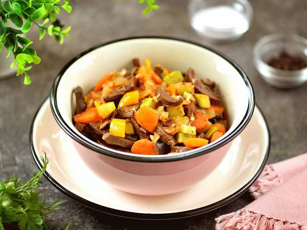 Соберите все необходимые продукты для приготовления тушеного свиного сердца с овощами.