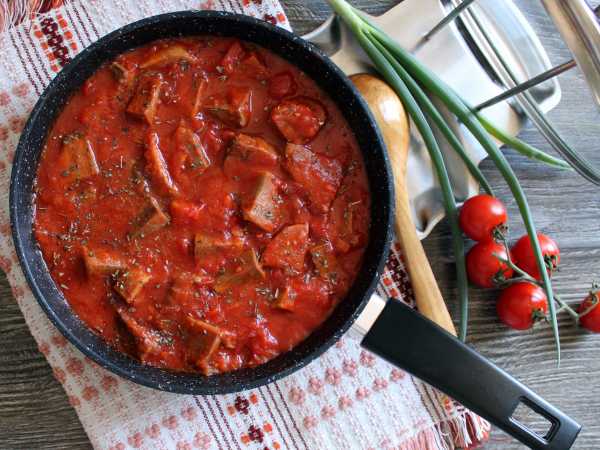 Для варианта гуляша из говяжьего языка подготовьте ингредиенты по списку к рецепту. Чтобы приготовить соус, подходят консервированные томаты, свежие томаты, томатный сок или томатная паста.