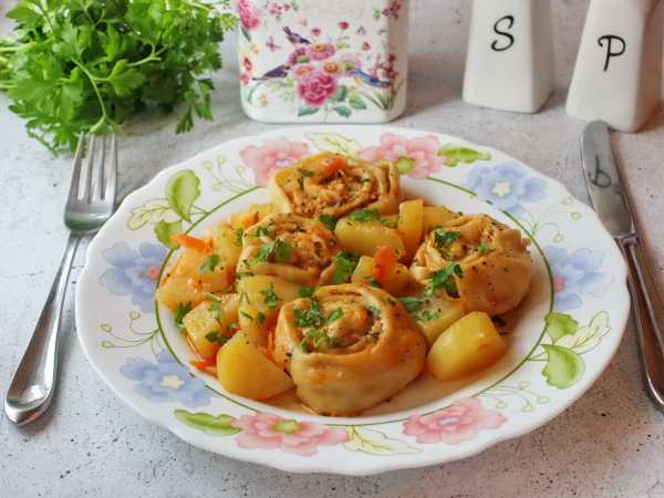 Соберите ингредиенты для приготовления штрулей с фаршем и картошкой на сковороде.