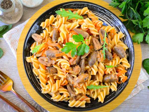 Соберите все продукты для приготовления куриных сердечек с макаронами.