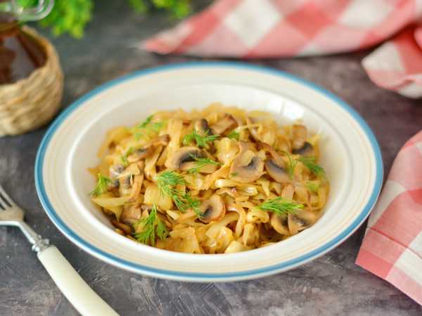 Соберите необходимые продукты для приготовления жареной капусты с шампиньонами.