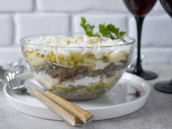 Нарезаем мелко говядину и смешиваем её с чесноком. Чеснок можно нарезать или выдавить через пресс. Выкладываем мясо сверху картошки и также смазываем майонезом.