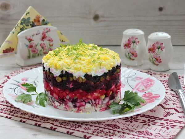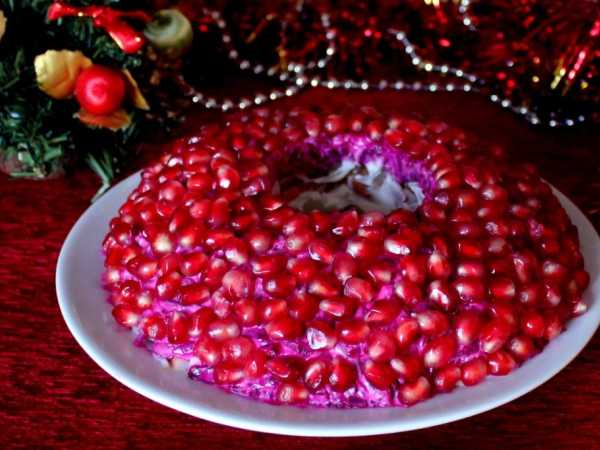 Затем можно просто сделать сеточку из майонеза и украсить верх салата гранатовыми зёрнами. Если хотите, то можно верх смазать майонезом более обильно. Я много майонеза не люблю, поэтому стараюсь использовать его как можно меньше. Оставить салат "Генерал" на час для пропитки, затем аккуратно снять формочку.