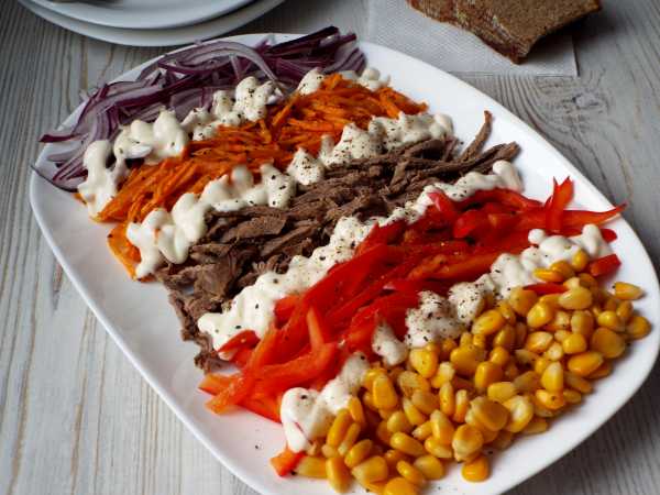 Для салата подготовить все необходимые продукты по списку. Говядину следует сварить заранее, так как варится она не менее часа. Картофель, свеклу и морковь также необходимо предварительно сварить и по отдельности натереть на тёрке.