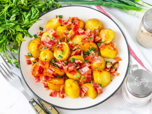 Посыпать сушеными ароматными травами (розмарин, тимьян, базилик), растереть их между пальцами. Запечь картошку с беконом в духовке при 180 градусах без конвекции 40-50 минут.