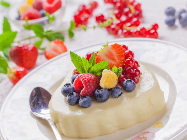 Когда желе застынет, десерт можно подавать к столу. По желанию, готовый десерт можно украсить, добавив щепотку натертого белого шоколада и веточку мяты.