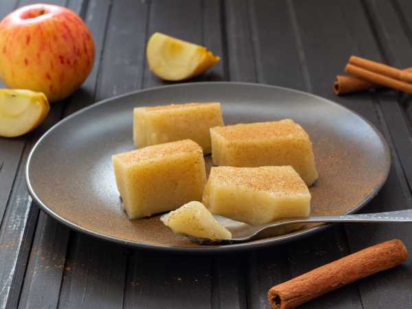 Готовая яблочная пастила выглядит вот таким образом. Пока она горячая, она будет немного мягкой, оставьте ее просто полежать при комнатной температуре, она остынет и затвердеет. Чтобы ее проще было снять с пергамента, разрезаем пергамент вместе с пастилой ножницами.