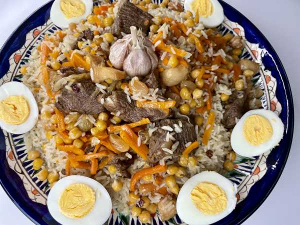 В сковороде вытопить бараний жир, срезанный с мяса, и всыпать лук с морковью. Периодически помешивая, довести до состояния мягкости.