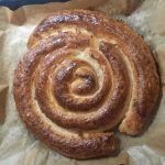 Слоеный пирог «Улитка» с фаршем готов. Извлечем его из духовки и дадим слегка остыть, затем переместим на блюдо.