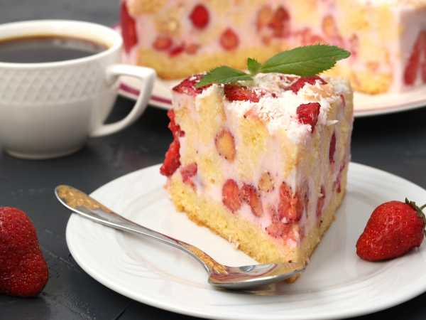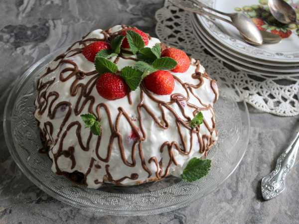 Готовый десерт украсьте по настроению. Я присыпаю бисквит натертым шоколадом и украшаю взбитыми сливками, листьями мяты и вишней.