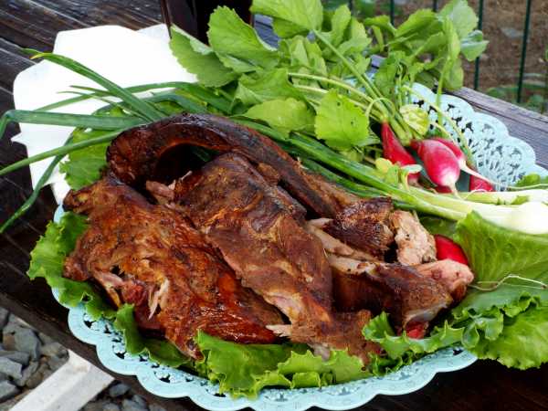 Запеченные в духовке в рукаве свиные рёбрышки готовы к подаче.