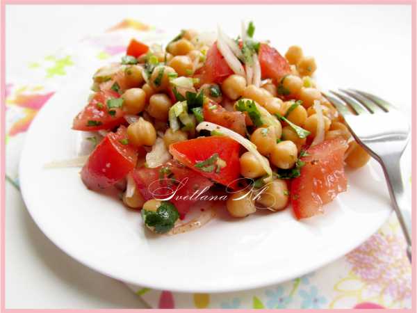 Салат с нутом, помидорами и огурцами очень сытный и в то же время легкий, вполне может заменить ужин и подойдет как гарнир.