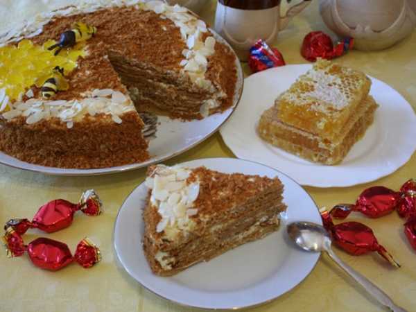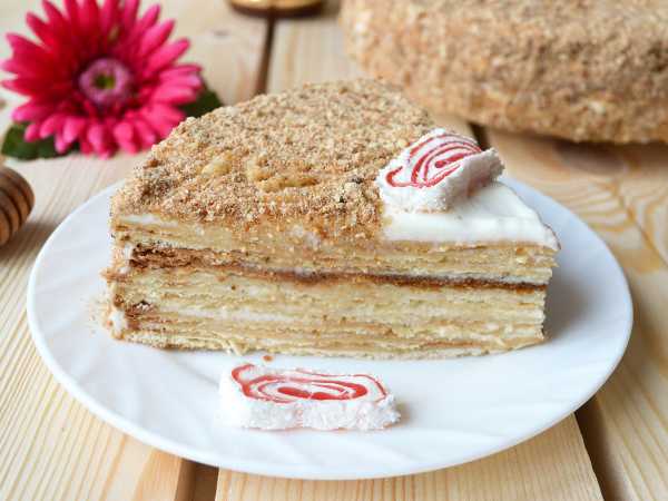 Я побоялась, что будет суховато и добавила пропитку из воды и мёда. И коржей сделала не 10 а 8, но лучше было бы сделать по рецепту, получились толще, чем хотелось бы)
