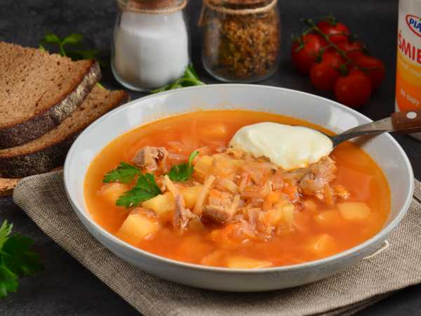 Добавить в борщ готовую зажарку, перемешать и дать покипеть 5 минут. В это время выправить борщ с говядиной на соль, сахар и кислоту. Огонь выключить и дать настояться несколько минут.