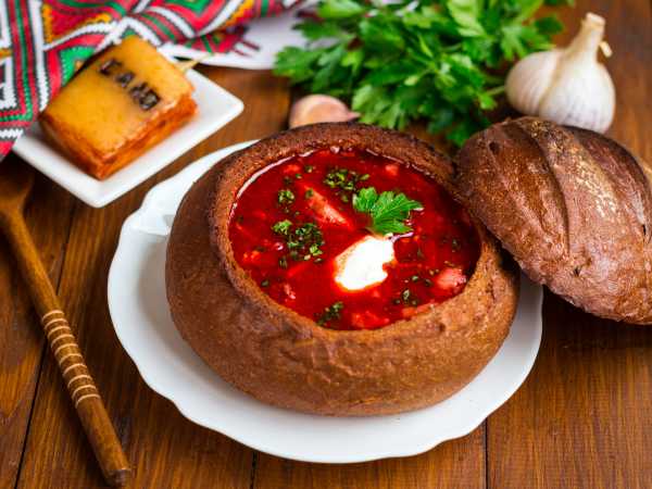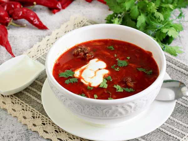 Подавать борщ со сметаной и зеленью, салом и чесноком.