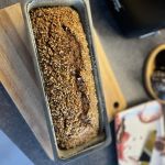Прямоугольную форму застелить пергаментом, выложить тесто. Сверху посыпать смесью коричневого сахара с орехами.
