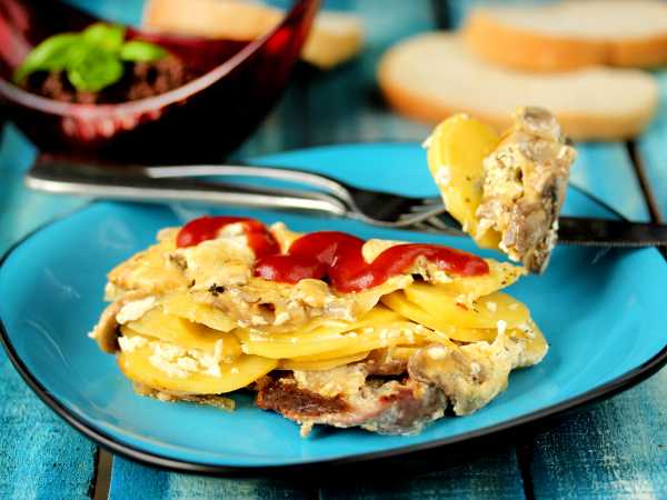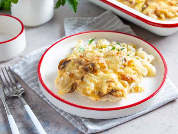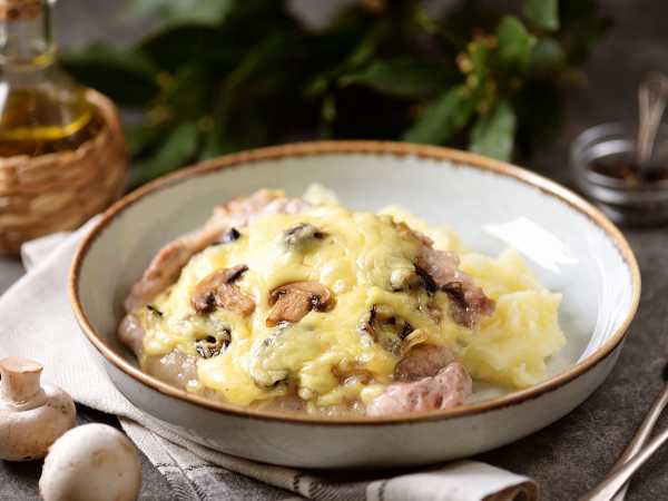 Отправьте противень в разогретую до 180 градусов духовку. Первые минут 20 можно не переживать, а спустя это время лучше контролировать процесс - ведь все ингредиенты быстро дойдут до готовности. Когда увидите, что свинина уже запеклась, можно доставать противень из духовки. Обычно через 30 минут мясо по-купечески с грибами доходит до готовности.