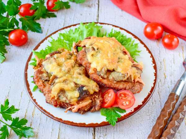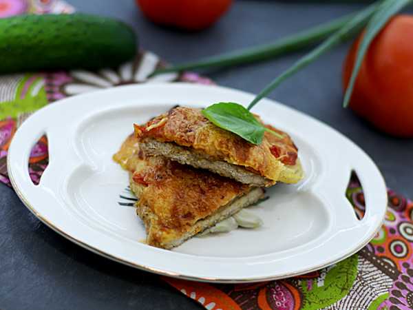 Сверху на отбивные выложите кружочки помидоров. Можно также подсолить щепоткой соли.