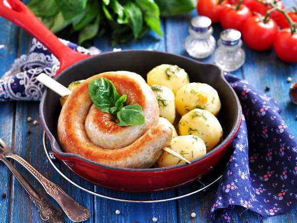 Опустить колбаски в кипящую воду и варить при слабом кипении 20 минут. Аккуратно вынуть их в форму для запекания.