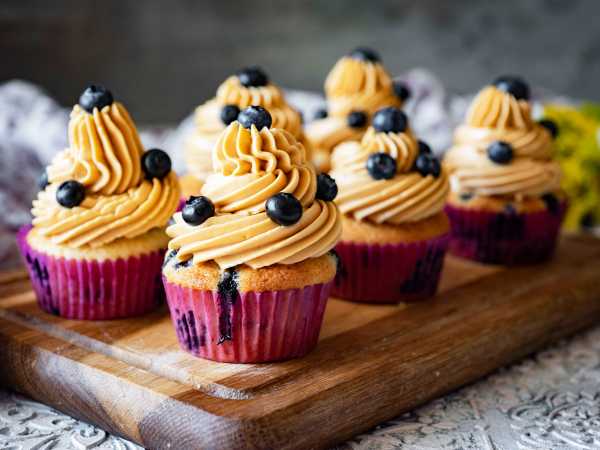 Выпекаем капкейки с клубникой в духовке на среднем уровне при температуре 200С без циркуляции воздуха до готовности (проба на сухую лучину). У меня в электродуховке заняло 30 минут.