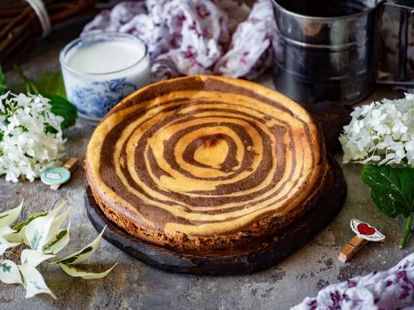 Для пирога понадобится разъемная форма диаметром 24 см. Дно формы застилаем бумагой для выпечки, бока смазываем сливочным маслом или маргарином. В центр формы поочередно выливаем 1 ст.л. белого теста, затем 1 ст.л. темного теста.