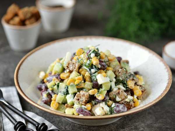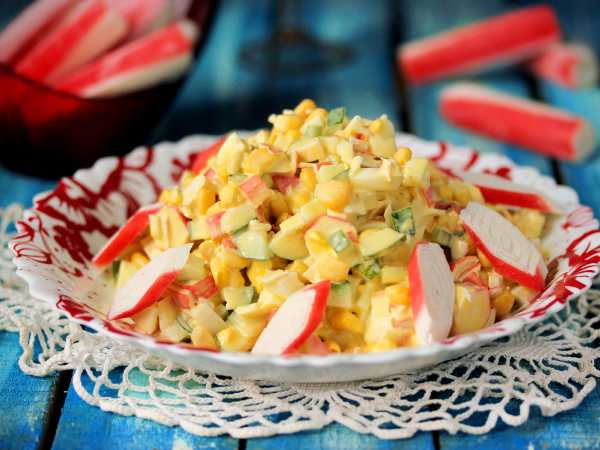Крабовый салат с огурцом и кукурузой готов. Приятного аппетита.