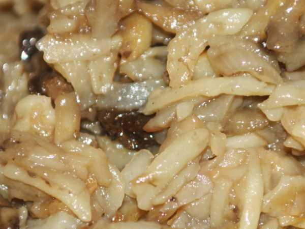 Затем к грибам добавить измельченный лук и обжарить все вместе.