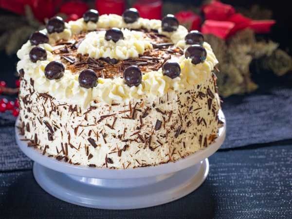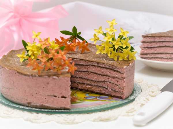 Накрыть торт вторым бисквитным коржом, его следует также пропитать сиропом, а сверху покрыть оставшимся заварным кремом, выравнивая шпателем поверхность. Отправить клубничный торт «Фрезье» в холодильник до полного застывания желейной прослойки. На это уйдет минимум 5 часов.