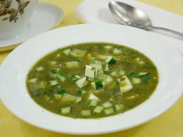 Зеленый щи из капусты готовы! Подаем к столу в холодном или горячем виде, со сметаной или без нее! Летнее диетическое кушанье станет прекрасным обедом в жару! Приятного аппетита!