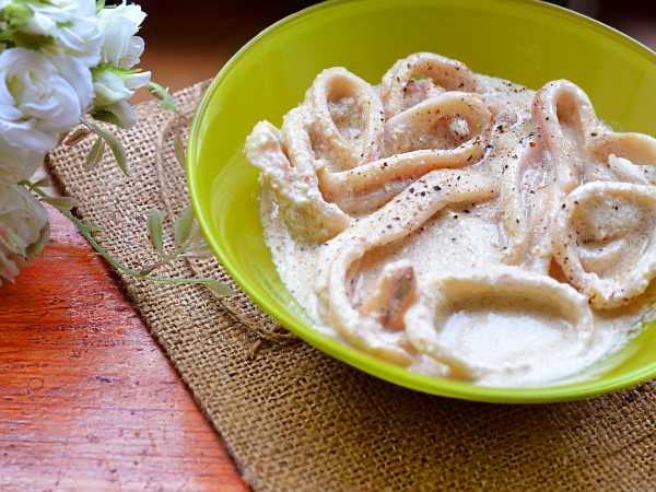 Эту очень простую и быструю в приготовлении закуску из кальмаров можно подавать как самостоятельное блюдо, а можно подать к ней на гарнир пасту или рис, с картофельным пюре тоже очень вкусно.