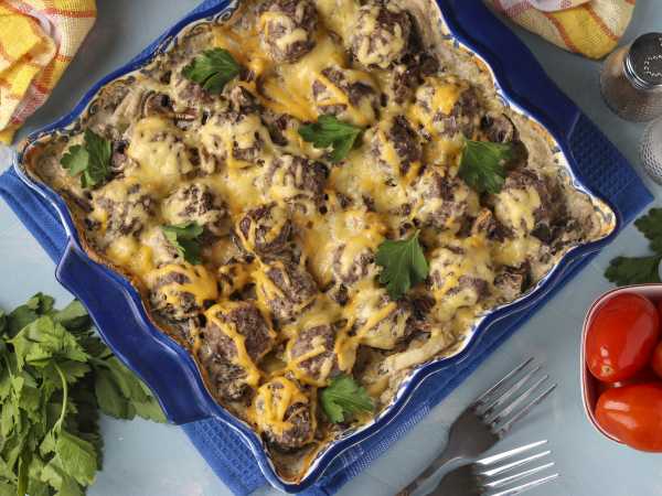 Разогреть духовку до 200 градусов и готовить блюдо 45 минут. Затем форму достать и посыпать запеканку натёртым твёрдым сыром.