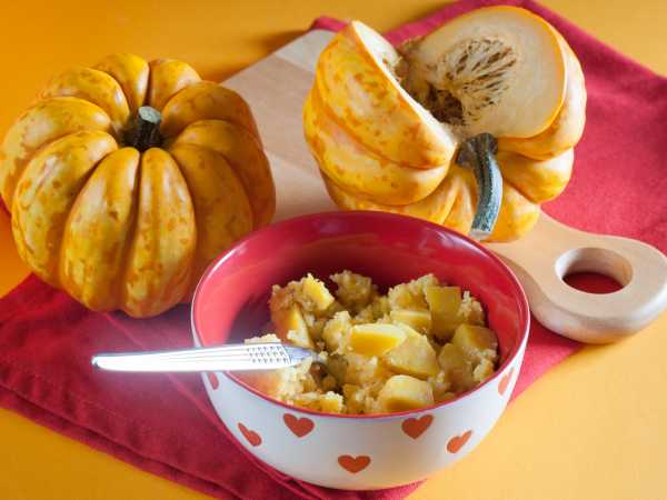 Слейте воду и поместите куски тыквы в глубокую емкость. Добавьте нарезанный небольшими кусочками банан.