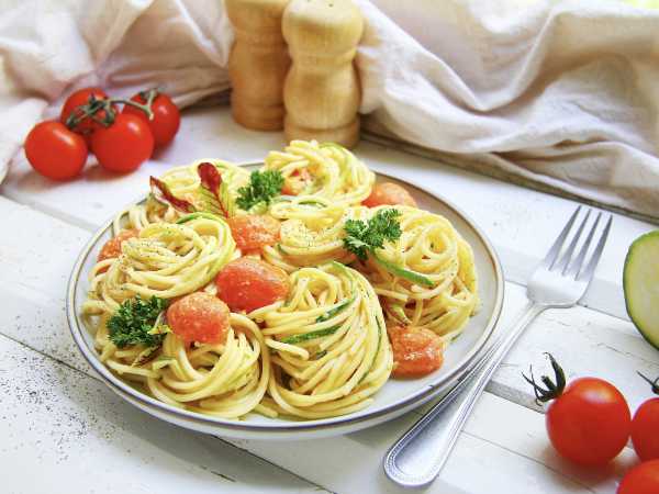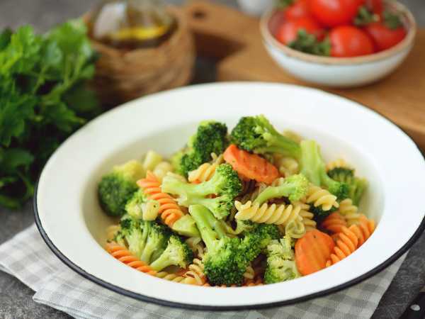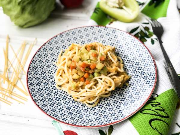 Готовую пасту с овощами в сливочном соусе выложим на тарелки и подадим к столу.